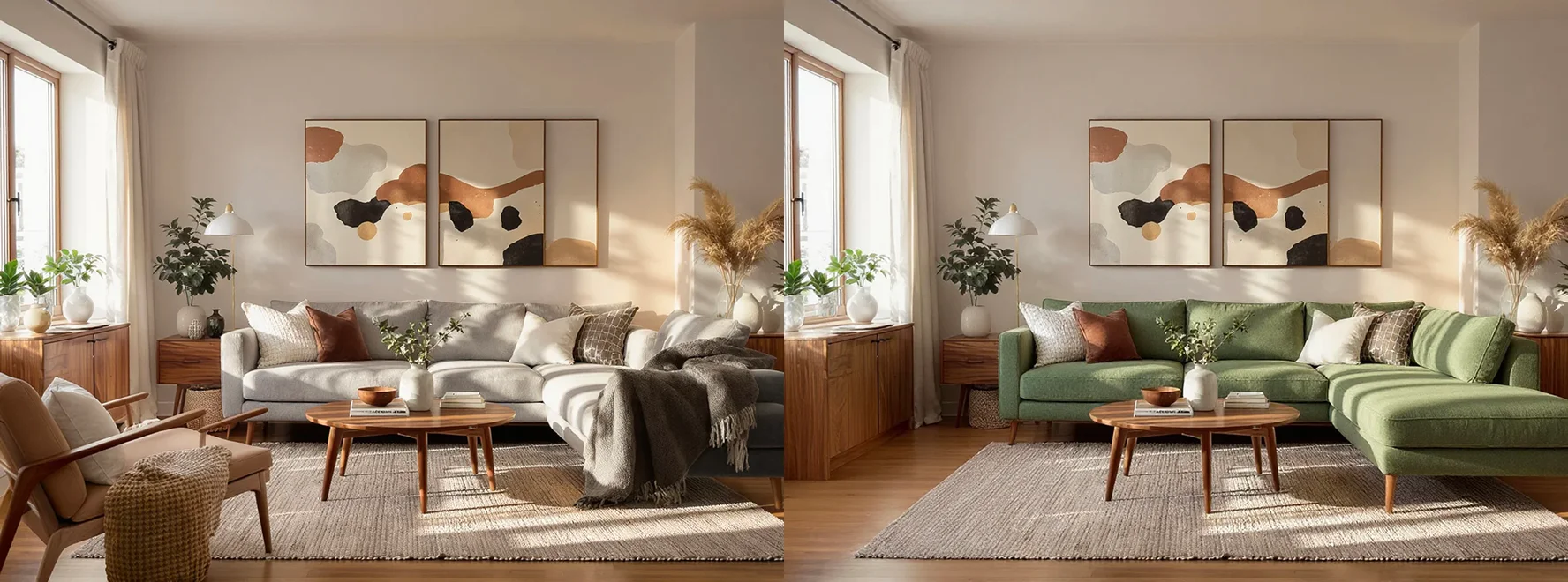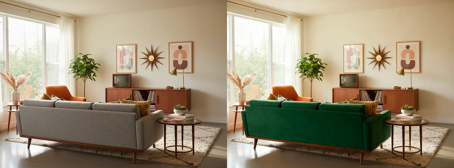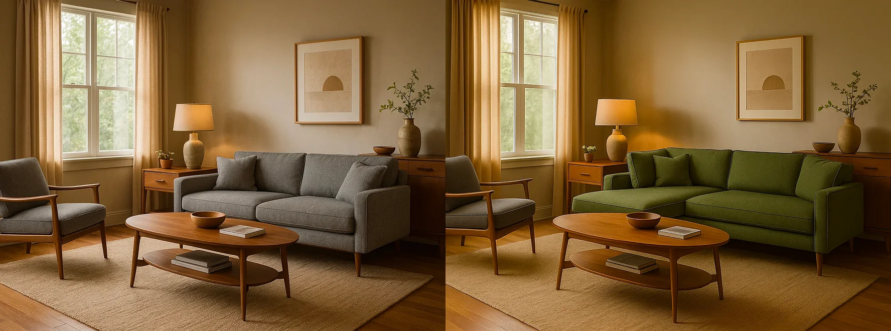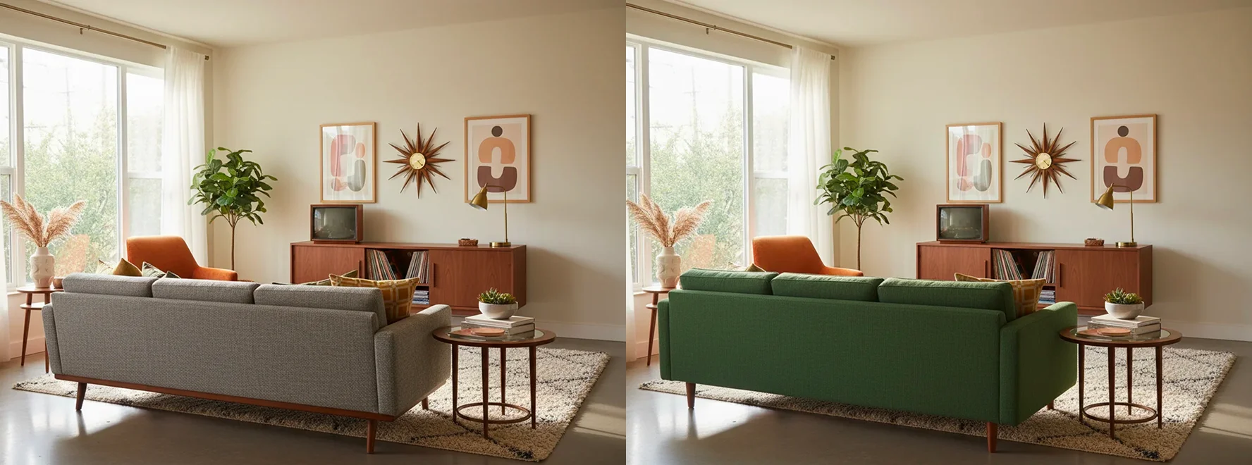 | Image to Image | Test precision editing and style control. | “Replace the sofa in this room with a green mid-century sectional. Keep the lighting and perspective consistent.” | |